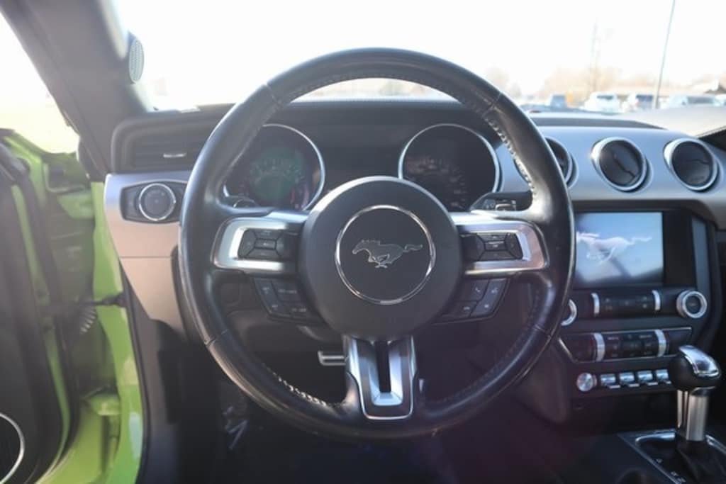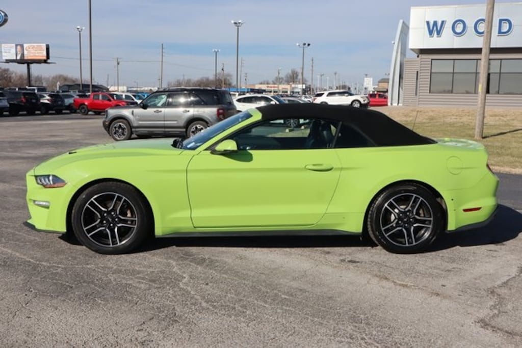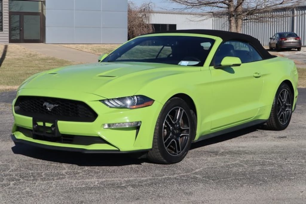 Lime 2020 Ford Mustang EcoBoost Premium RWD 10-Speed Automatic 2.3L I4 Turbocharged EcoBoost Air Conditioning, Auto-dimming Rear-View mirror, Brake assist, Bumpers: body-color, Compass, Convertible roof lining, Delay-off headlights, Driver door bin, Driver vanity mirror, Electronic Stability Control, Equipment Group 200A, Exterior Parking Camera Rear, Front Bucket Seats, Front Center Armrest, Front reading lights, Fully automatic headlights, Glass rear window, Illuminated entry, Leather Shift Knob, Low tire pressure warning, Outside temperature display, Overhead console, Panic alarm, Passenger door bin, Passenger vanity mirror, Power convertible roof, Power door mirrors, Power steering, Power windows, Rear window defroster, Remote keyless entry, Security system, Speed control, Speed-Sensitive Wipers, Steering wheel mounted audio controls, Tachometer, Telescoping steering wheel, Tilt steering wheel, Trip computer, Variably intermittent wipers, Voltmeter, Wheels: 18" x 8" Machined-Face Aluminum.